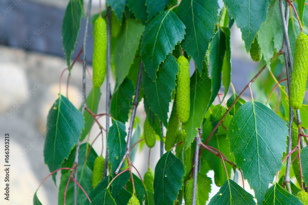 Tree brunches with birch catkins and green leaves, springtime. Photo depicting a macro view of bright colorful birch catkins. De focused, blurred background.