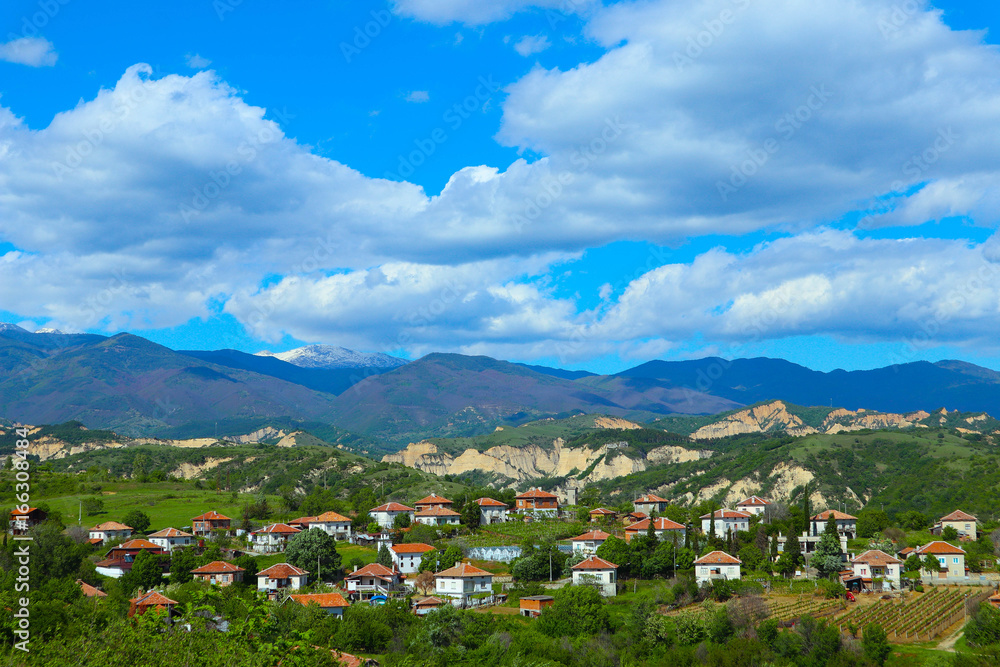 Europe, Bulgaria, Melnik city. Small vinery village in traditional style..Bulgarian Balkans mountain landscape, sandstones countryside.