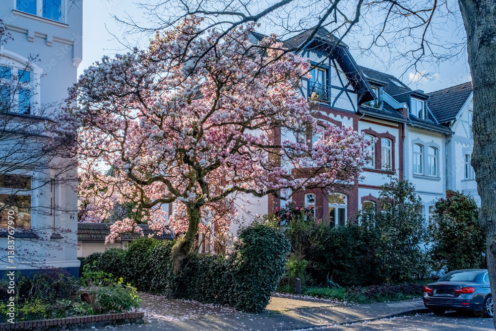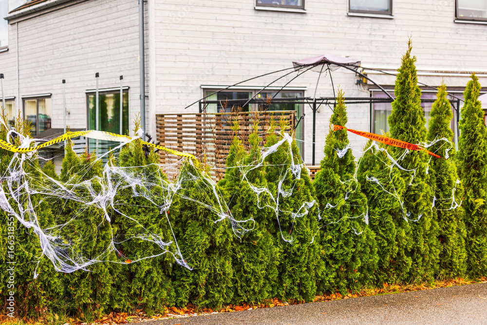 Beautiful view of Halloween decoration with fake spider webs and warning tapes on green hedge in front of villa. Sweden.