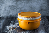 Bowl with rising yeast dough and fresh yeast on the dark table
