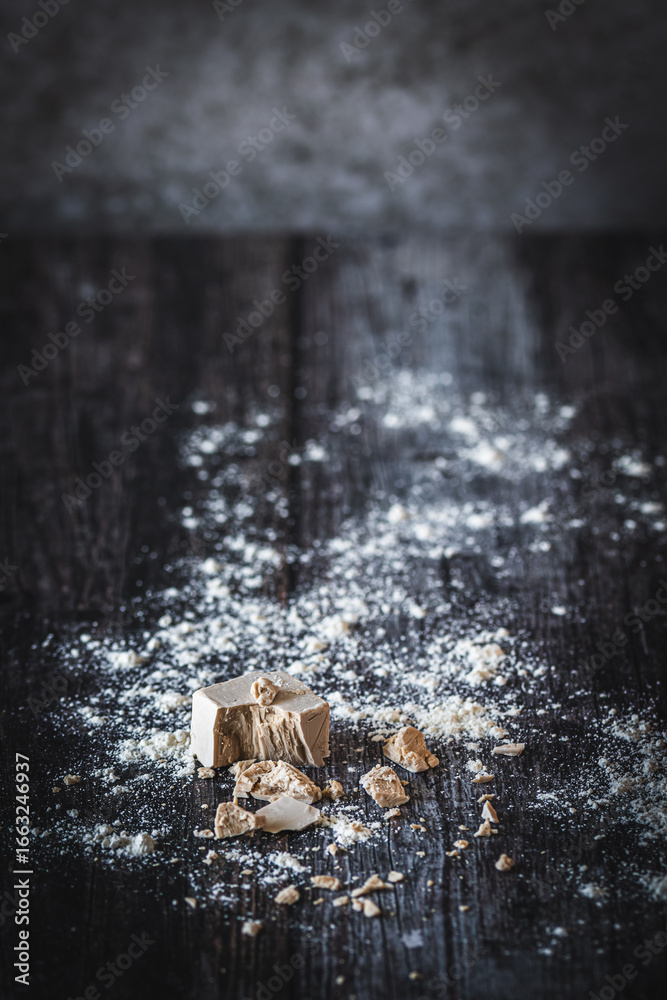 Fresh yeast crumbs and flour on dark background