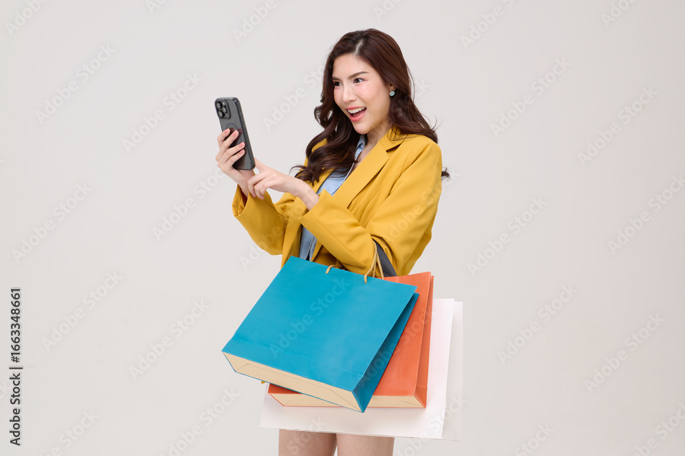 Excited Asian woman in yellow blazer and denim shorts holding shopping bags using smartphone representing online shopping mobile payment and modern retail lifestyle