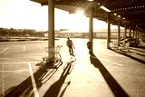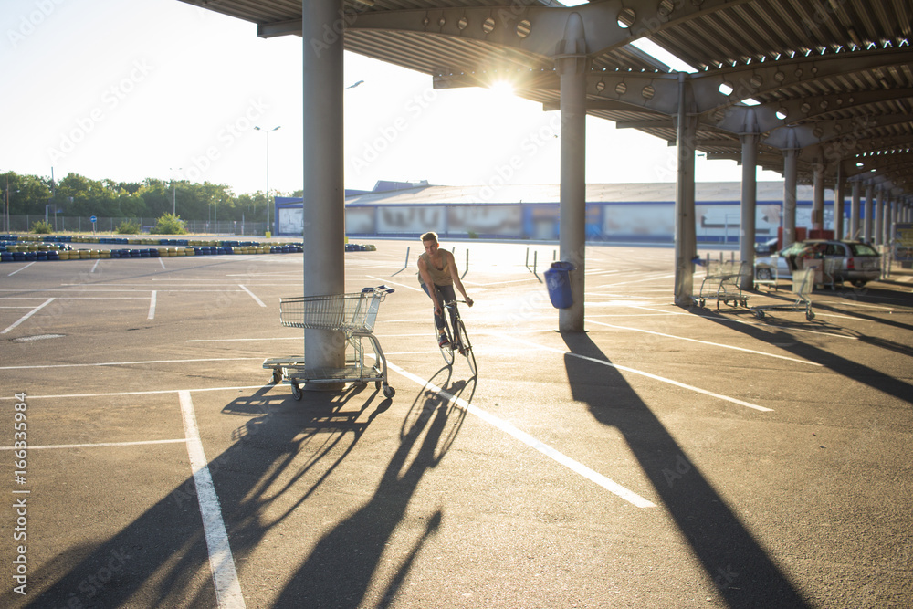 young bicycle rider having fun and ride in the morning on empty mall parking during sunrise , hipster ride alone on blue bicycle