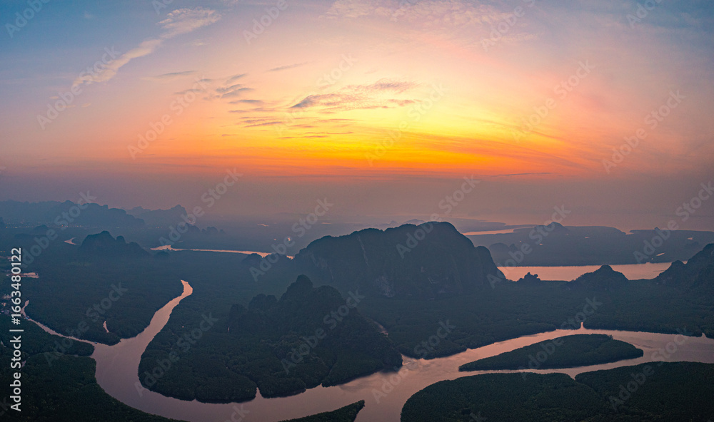 Aerial view of beautiful heart island in Mangrove River in golden sunrise. Love in mangrove forest