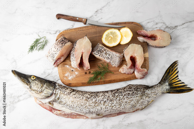 Whole peeled fish and prepared steaks of fresh pike with spices and lemon slice for cooking on wooden cutting board on marble stone background.