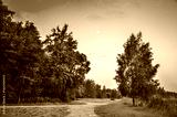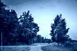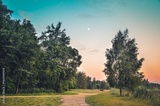 Summer morning landscape. Green trees with colored sky and moon in the background.