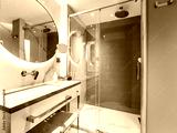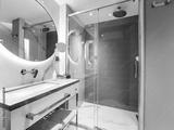 This modern bathroom features a stylish shower along with elegant fixtures and accessories