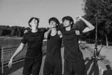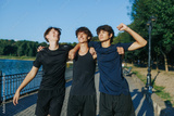 Group of teenage boys laughing and walking together by the lakeside in summer