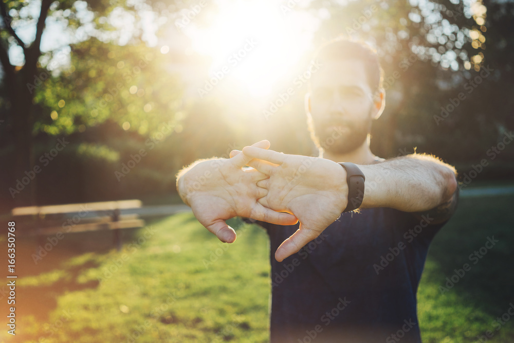 Attractive bearded man doing stretching workout before running at the sunset