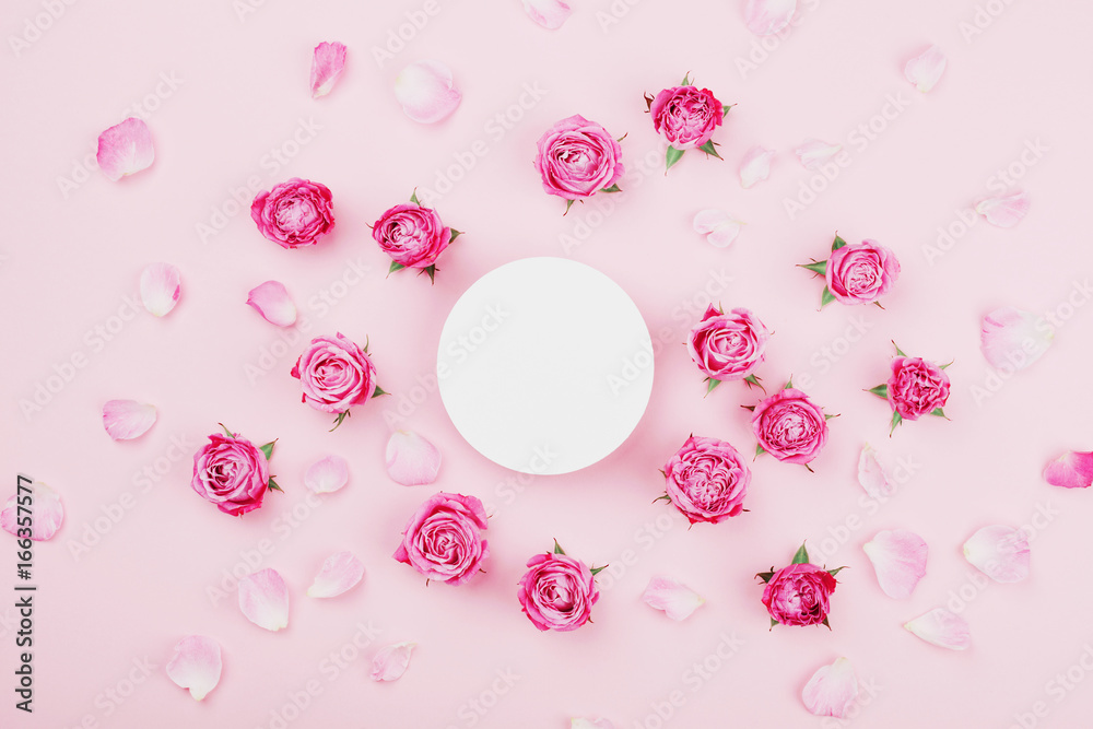 White round blank, pink rose flowers and petals for spa or wedding mockup on pastel background top view. Beautiful floral pattern. Flat lay style.