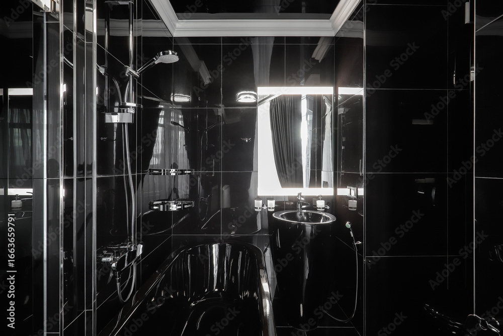 Black bathtub and sink in the bathroom