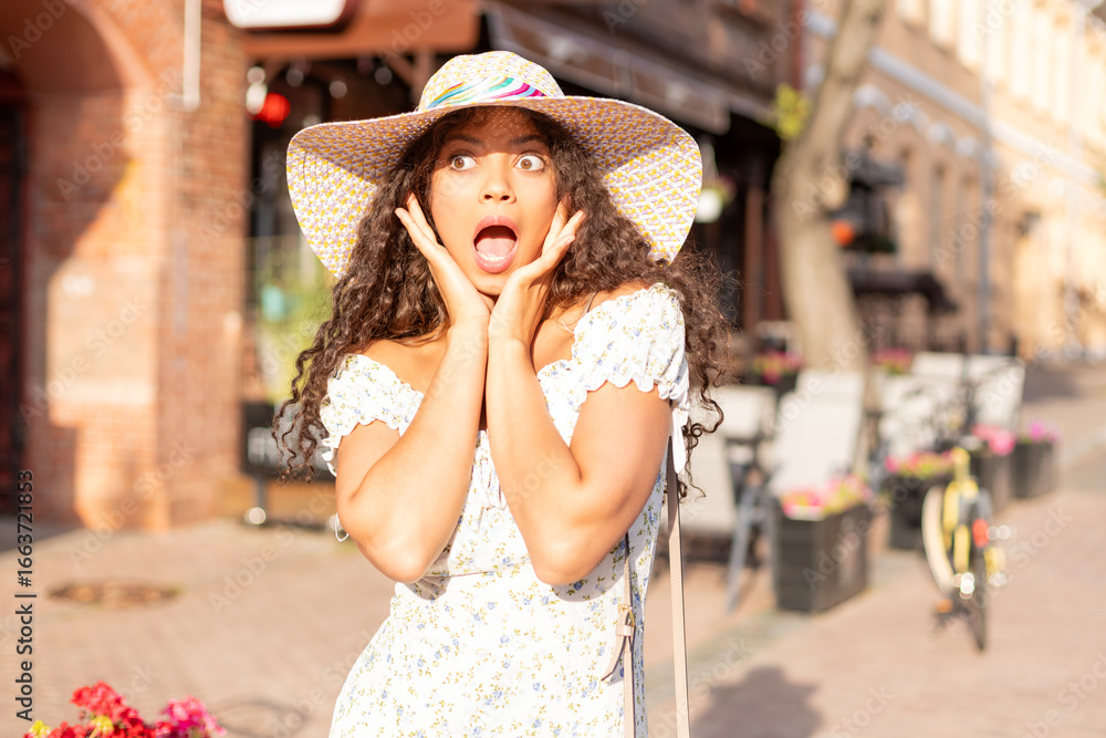 Beautiful smiling brunette model dressed in summer hipster clothes. Funny and positive woman having fun.