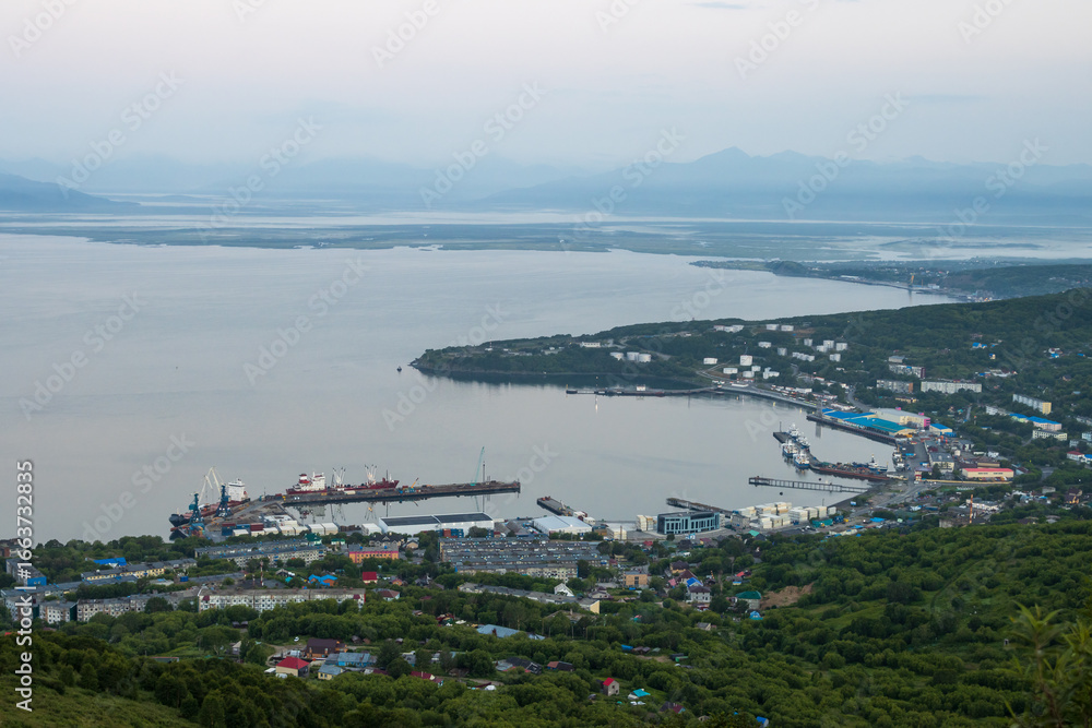 Top view of the port town. Cargo ships are moored to the piers of the port. Residential buildings and industrial facilities on the coast of the bay. Petropavlovsk-Kamchatsky, Kamchatka Krai, Russia.