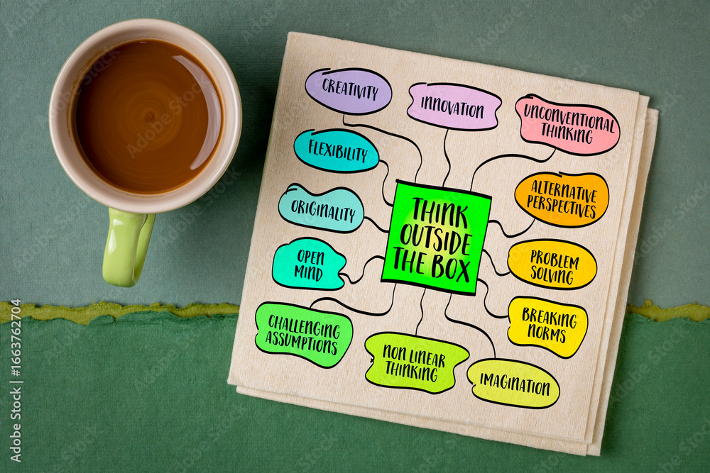 think outside the box, powerful theme that encourages creativity, innovation, and unconventional problem solving, sketch mind map infographics