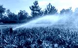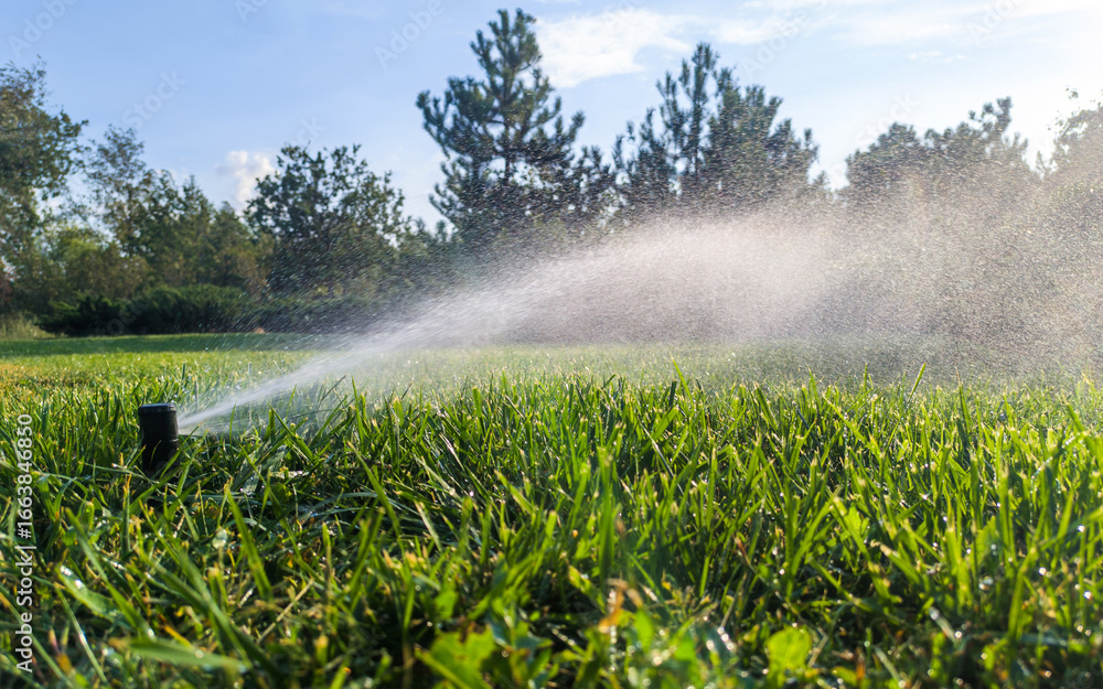 Automatic garden irrigation system watering lawn. Automatic equipment for irrigation and maintenance of lawns, gardening
