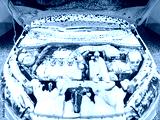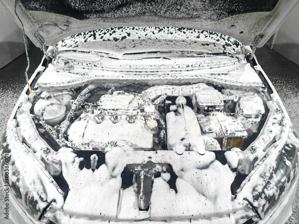 Cleaning the car engine with special foam. Washing the engine at a car wash.