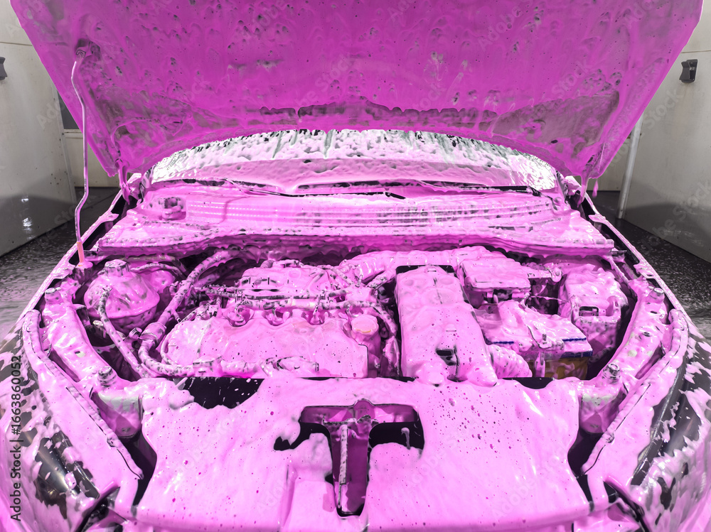 Cleaning the car engine with a special chemically active foam. Washing the engine at a car wash.