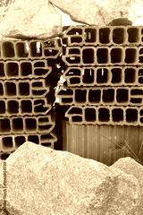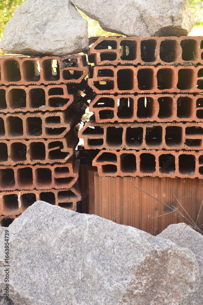 Pilha de tijolos vermelhos de alvenaria e pedras de granito para construção de casa típica, arquitetura brasileira