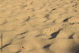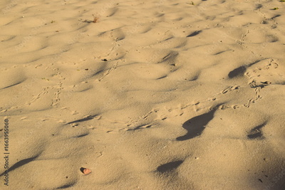 Rastro de passarinho em areia branca de praia, patas de pássaro no litoral praiano, férias na beira mar brasileira