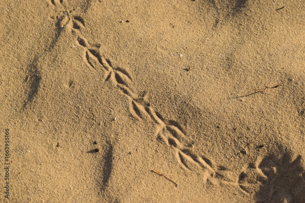 Rastro de passarinho em areia branca de praia, patas de pássaro no litoral praiano