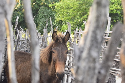 Mula marrom em curral no interior do nordeste, Burro dentro de cerca em fazenda sertaneja