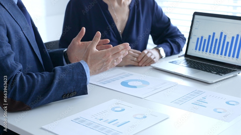 Businessman and business woman reviewing financial documents, collaborating over laptop screen, analyzing market charts for strategic corporate planning. Businesspeople and finance concept