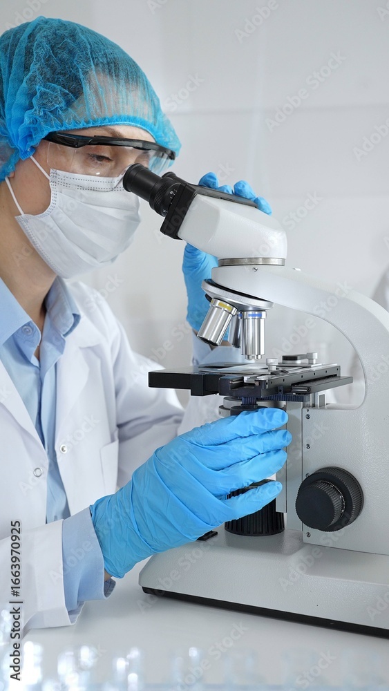 Female scientist wearing a mask and blue safety gear, using a microscope for research while a male colleague works in the background. Medicine, healthcare and science concept