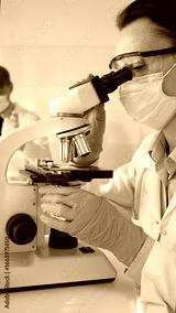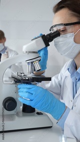 Female scientist wearing mask and blue gloves using microscope doing scientific research in modern laboratory with colleague working in background. Medicine, healthcare and science concept
