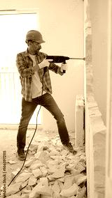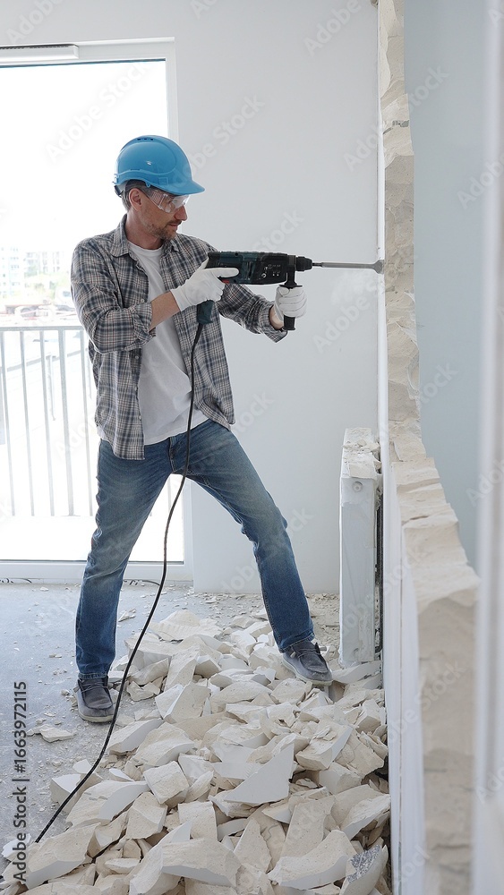 Male construction worker wearing grey checked shirt and blue hardhat is demolishing a wall with a hammer drill, creating construction debris on the surrounding floor surface. Renovation concept
