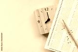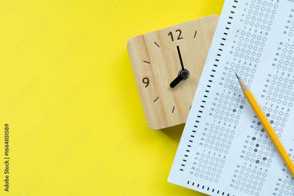 close up pencil and alarm clock on answer sheets with yellow background, education concept