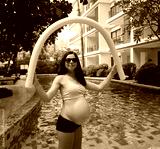 Pregnant young woman about to do exercises in pool with foam swim noodles