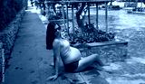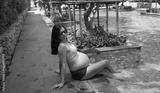 A pregnant woman in a turquoise bikini sits by a swimming pool