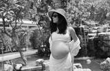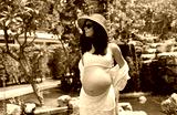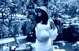 A pregnant woman is gracefully standing in front of a beautiful waterfall rock