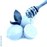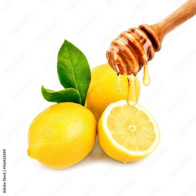 Fresh honey dripping from a spoon on a lemon. On a white background.