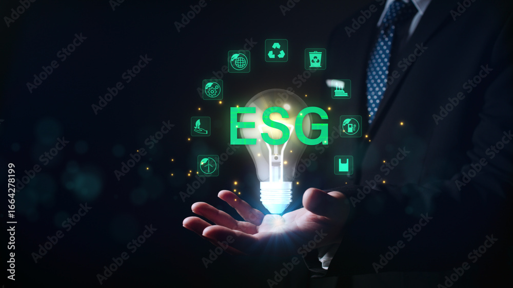 ESG sustainability concept with light bulb and eco icons in businessmans hand, representing innovation, green energy, and ethical responsibility. 3d Rendering