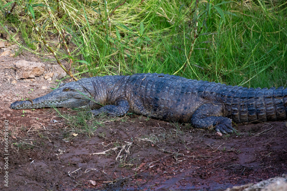 A Freshwater Crocodile (Crocodylus johnstoni) basking in the sun. Lake Argyle, Western Australia.