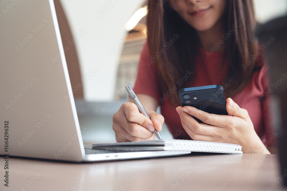 Woman in casual business clothes working on laptop and using smartphone, writing on notebook at coffee shop, digital nomad. Student using mobile phone, online studying via laptop, e-learning