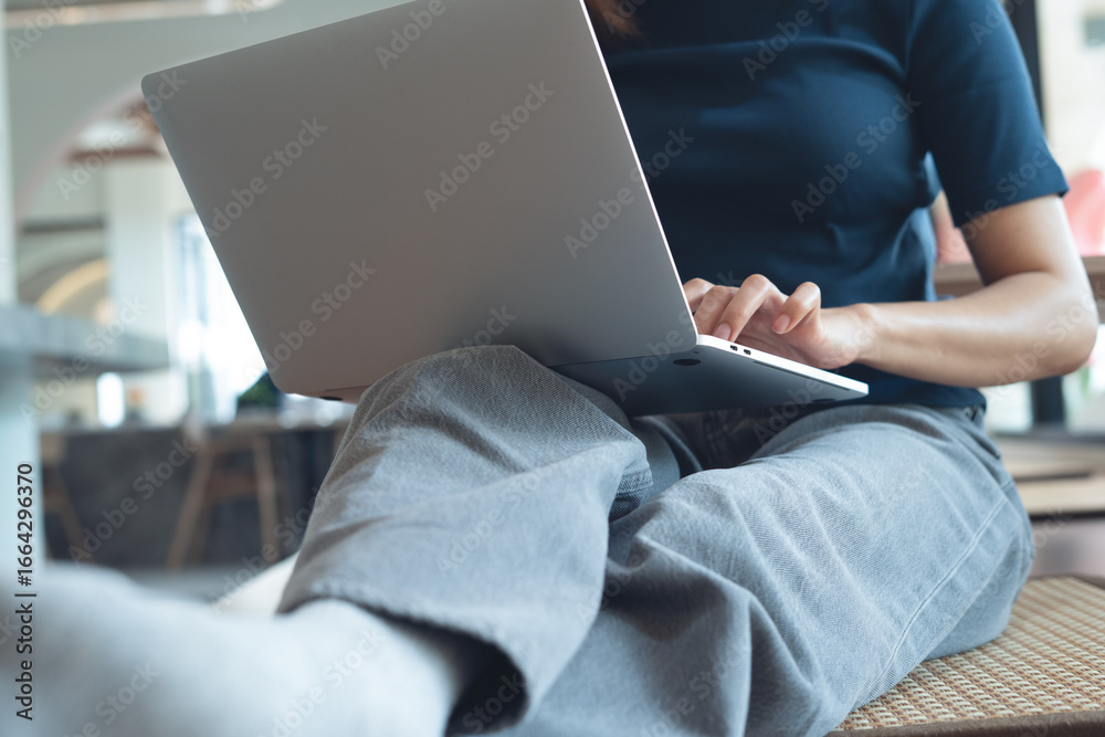 Woman sitting on the floor, remote working on laptop computer at home. Freelancer person using laptop, surfing the internet in living room, digital nomad, online job, close up