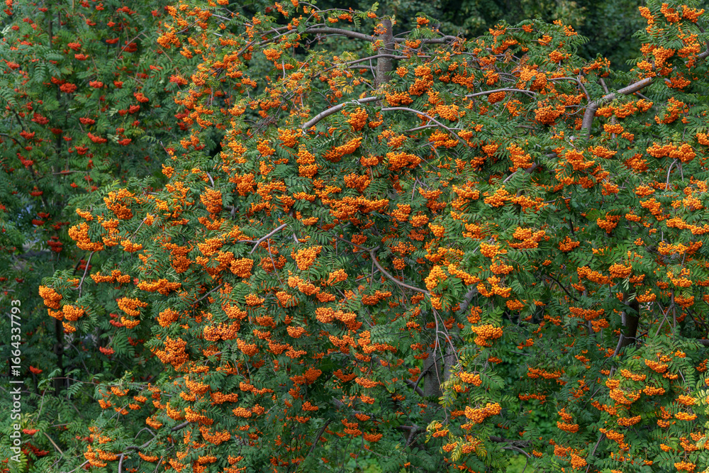 A rowan tree with bright orange berries stands out against lush green leaves. The image reflects the vibrant colors and natural abundance of early autumn.