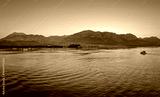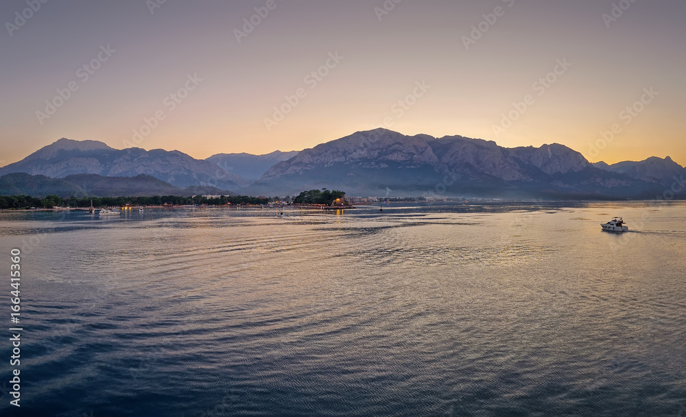 Seascape sunset panorama over the Mediterranean Sea near Kemer, Turkey. Panoramic view to the moonlight beach at dusk and a lone boat cruises across the calm water towards the majestic mountains