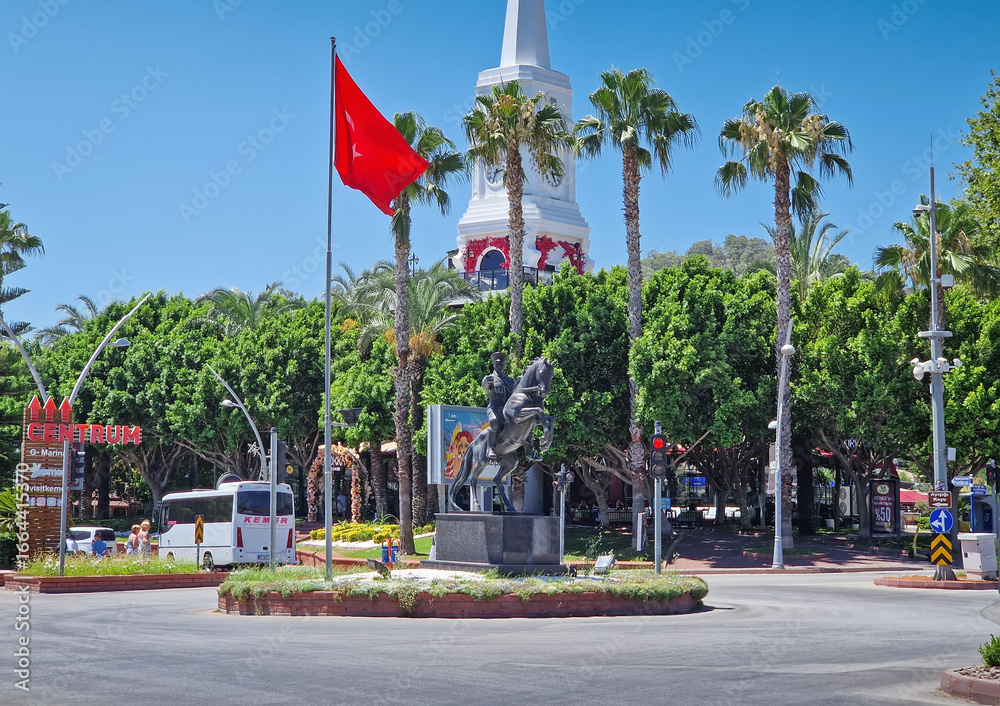 Kemer city centrum, boulevard traffic scene with Ataturk statue on horseback in front of Kemer Saat Kulesi today Cafe Mokka, and red turkish flag winding prominently