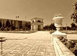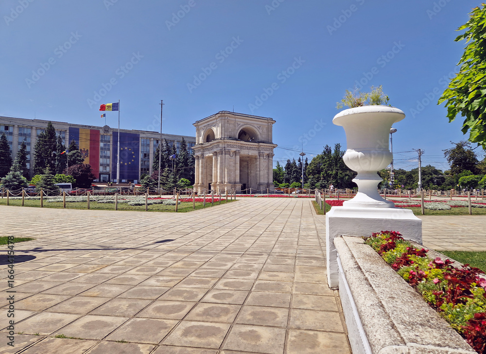 CHISINAU, MOLDOVA, Triumphal Arch as popular historical landmark of the capital with the Moldovan Government House in the background