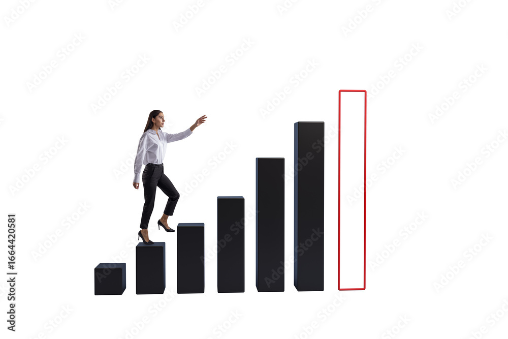 Female leader climbing black staircase chart bars, clean style on white background, symbolizing ambition, success, and business growth