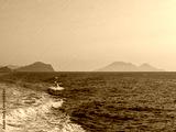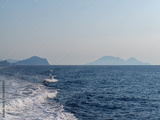 Wake trail on Mediterranean sea with volcanic archipelago Aeolian Islands on horizon. Clear sky, little mist horizon, blue and yellow colours.