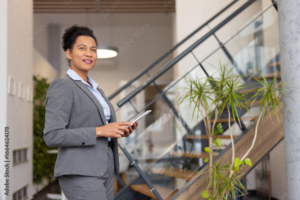 Professional businesswoman working on digital tablet, representing corporate innovation and leadership in contemporary workspace
