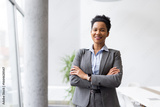 Portrait of a successful businesswoman standing in a modern office with arms crossed, exuding confidence and professionalism