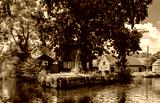 Tourismus in Brandenburg, Landschaft mit Fließgewässern, Häusern, Kähnen, Kajaks und Waldgebiet im Spreewald in Lübbenau und Lehde, Brandenburg, Deutschland