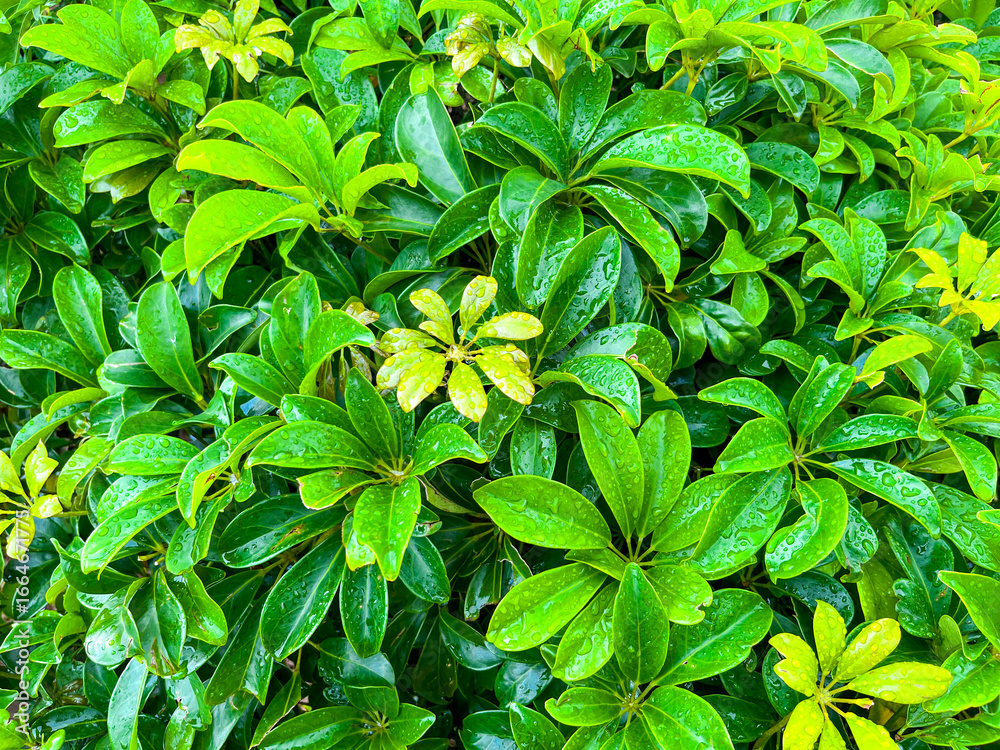 Close-up of variegated Schefflera or Umbrella plant with green and yellow leaves covered in fresh raindrops. Tropical ornamental foliage, natural garden background, and decorative houseplant texture.