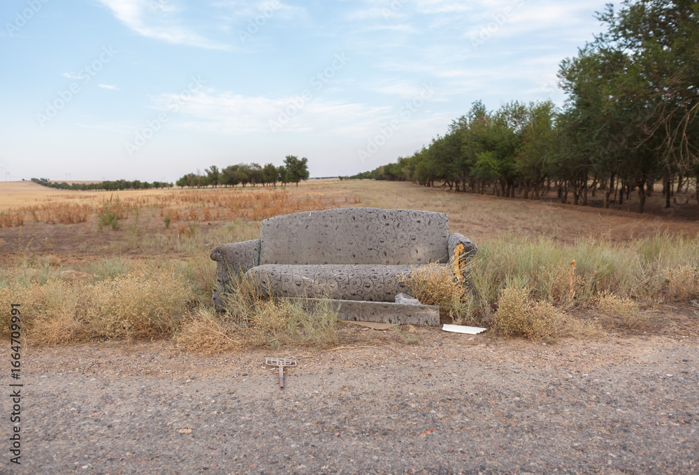 frontal view of an old sofa standing in the grass against a background of fields, trees and a blue sky with clouds