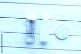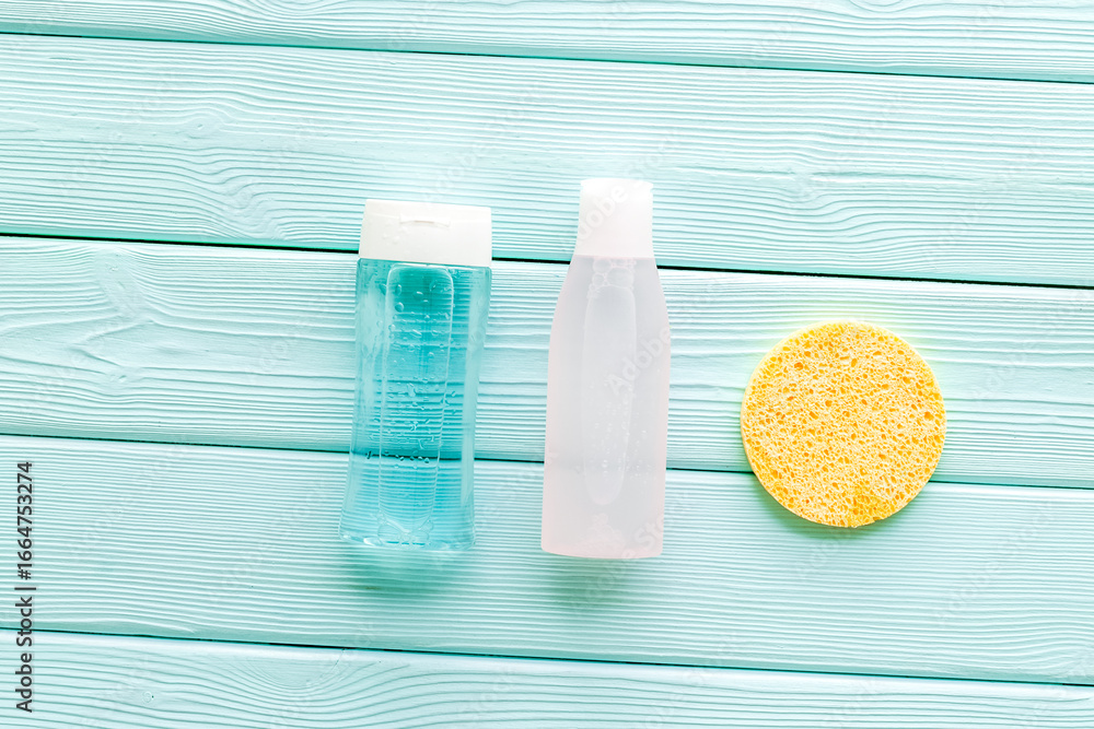 facial tonic, lotion and sponge for face care on mint green wooden background top view mock up